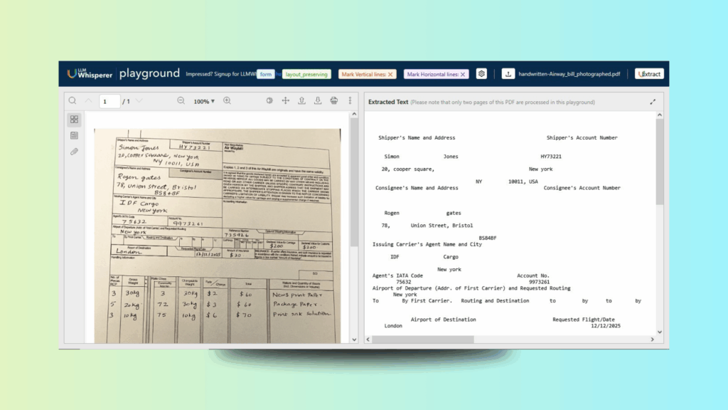 Extracting text from structured air waybills can flatten handwritten fields, tables and checkboxes. This results in fragmented text that loses the connection between labels and values. It makes details such as shipper information, cargo weight and insurance difficult to parse.