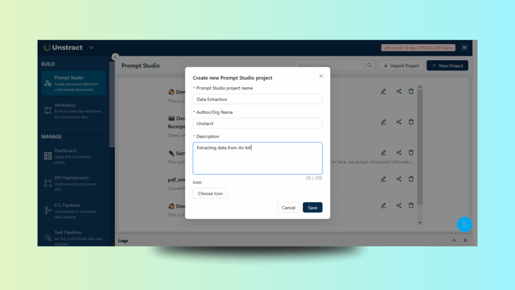 We will now set up and test a Prompt Studio Project, similar to how we extracted a text in LLMWhisperer. In this workflow, Prompt Studio provides a controlled environment to design, refine and evaluate prompts, ensuring they deliver consistent outputs before being integrated into automation pipelines.