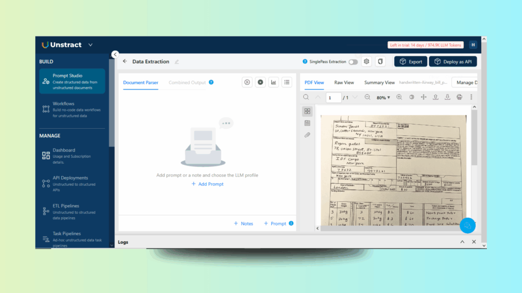 Unstract is a no-code intelligent document processing platform designed to simplify the complexity of unstructured data. It transforms PDFs, images and forms into structured, machine-readable formats.