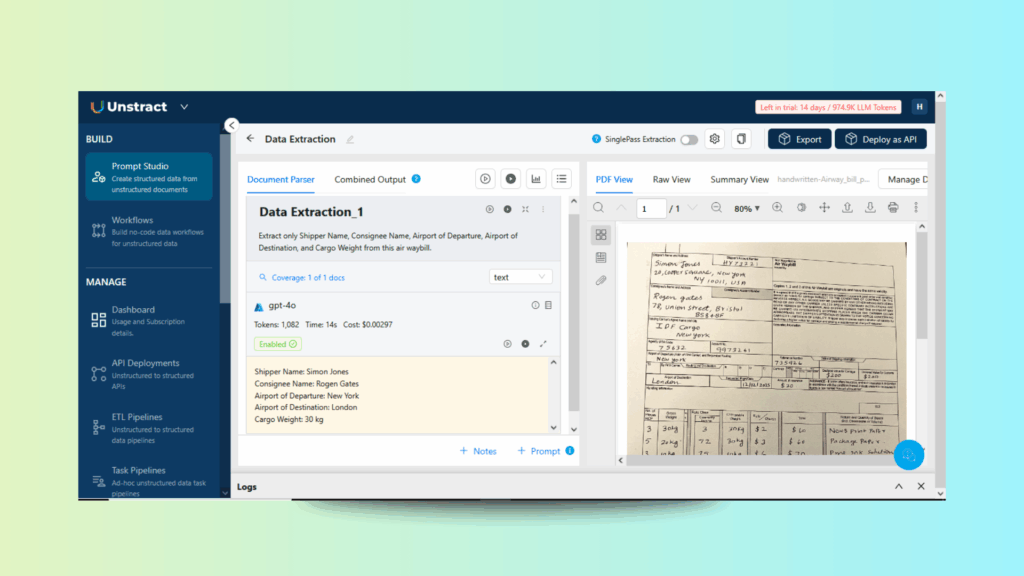This helps businesses automate shipment processing, reduce manual errors and speed up customs or compliance workflows. This output is far more reliable than what a generic OCR would produce and is immediately ready for consumption by Unstract for structured extraction.