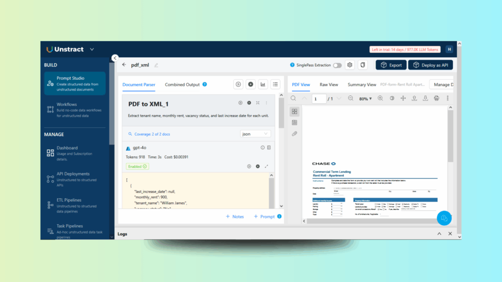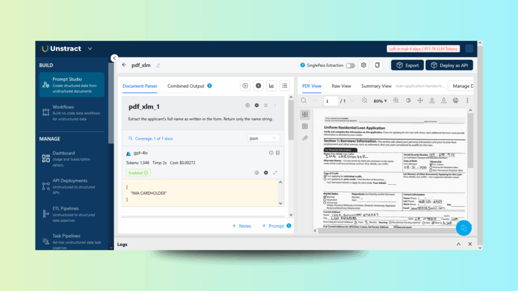 Prompt Studio, a key feature, offers a visual interface for creating and testing prompts. Teams can use natural language queries to define fields such as “Loan Amount” or “Tenant Name”.