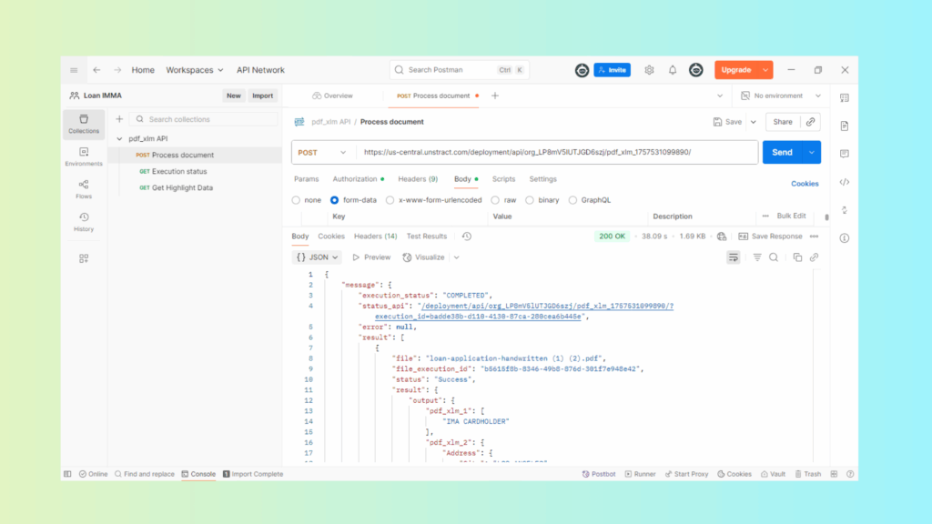 Now that we’ve verified the deployment in Postman, let’s switch to Python to automate the workflow end-to-end. We’ll submit a PDF to the Unstract API, poll until extraction completes, then capture the JSON output, convert it to XML, print both, and save them.
