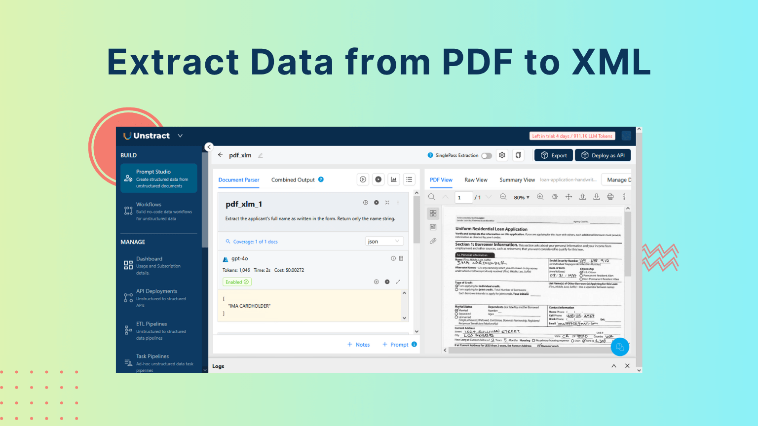 We’ll demonstrate how a loan application PDF can be turned into structured XML. The process uses LLMWhisperer for layout-aware OCR, Prompt Studio for field-level extraction and Python for conversion.