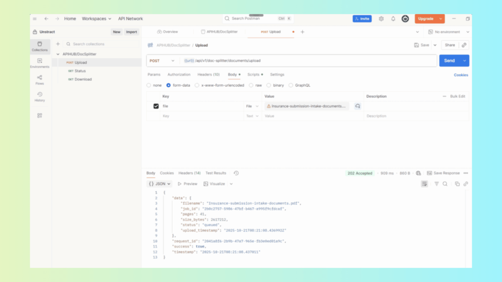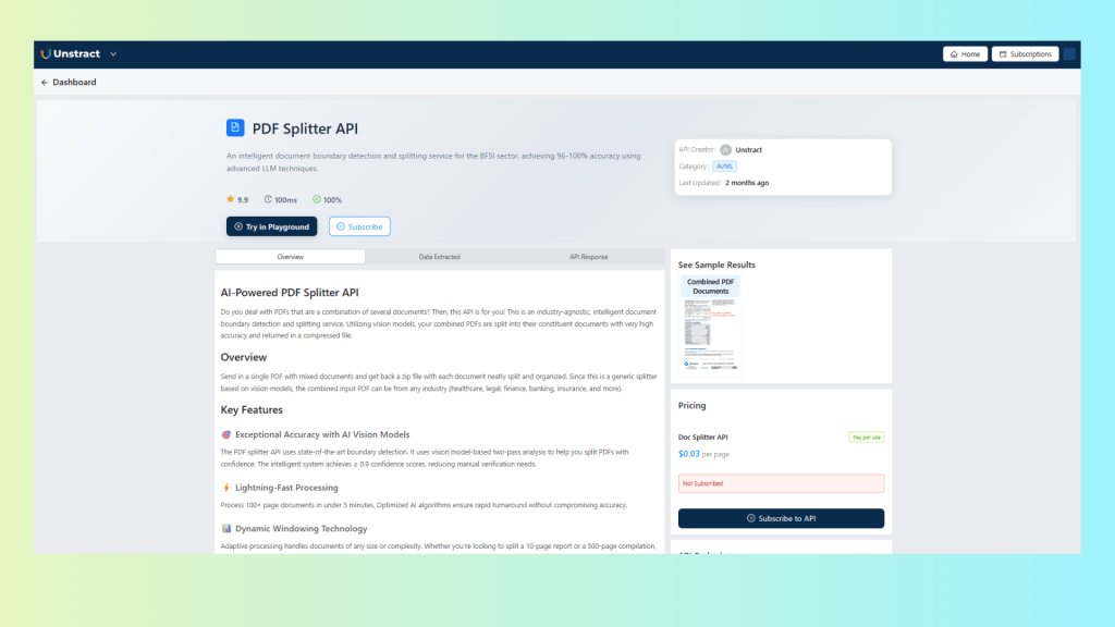 Using Unstract’s AI-powered PDF Splitter API, combined PDFs—loan packets, legal bundles, onboarding packets, insurance claim packages—are automatically separated into their individual documents.