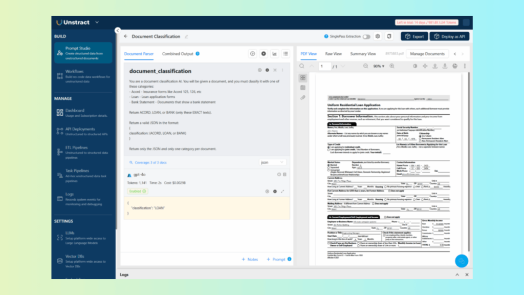 Unstract’s Prompt Studio allows teams to define custom classification logic using natural language prompts. Once deployed as an API, this logic can classify: