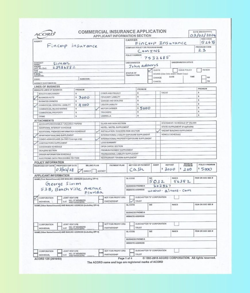 Let’s use LLMWhisperer to extract text from a real-world document. We will consider a scanned copy of an ACCORD commercial insurance application with checkboxes.