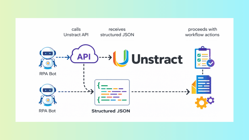 RPA bot → calls Unstract API → receives structured JSON → proceeds with workflow actions