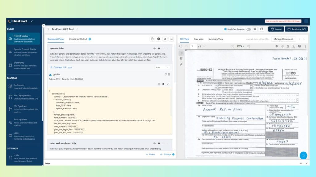 To demonstrate how OCR and RPA come together in practice, let’s walk through a real example: extracting structured data from a scanned handwritten tax form using Unstract’s Prompt Studio.