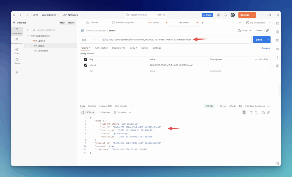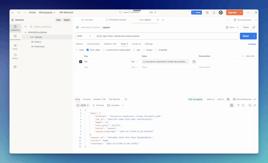 1. Upload the PDF – Just send your combined PDF to the API, whether it’s 5 pages or 500, Unstract handles it all without any fuss.