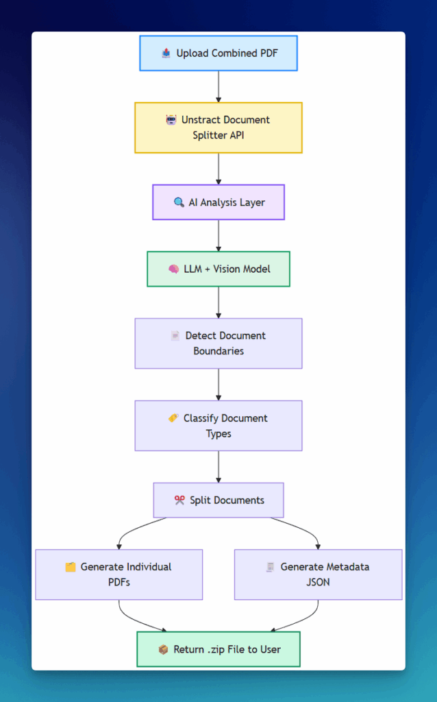 Unlike traditional PDF splitters that rely on rigid rules or manual page selection, Unstract’s API actually understands what’s inside your documents. It uses advanced AI (Large Language Models + Vision AI) to analyse both the text and the visual layout of each page. This helps it accurately detect where one document ends and another begins, just like a human would.