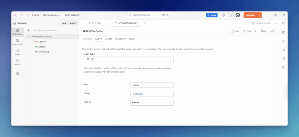 We’ll use Postman again to go through the steps: upload the file, check the progress, and download the results.