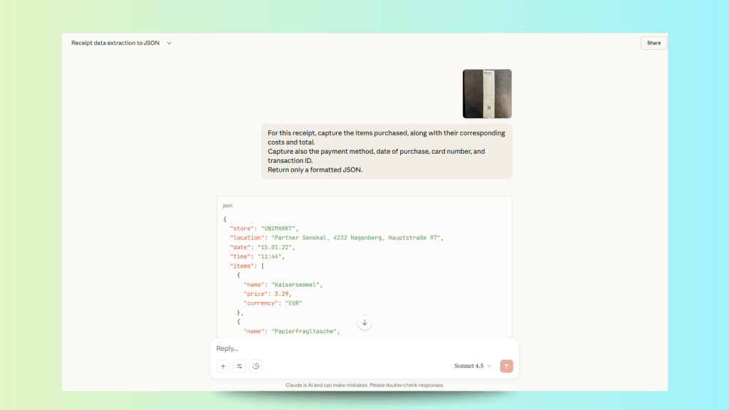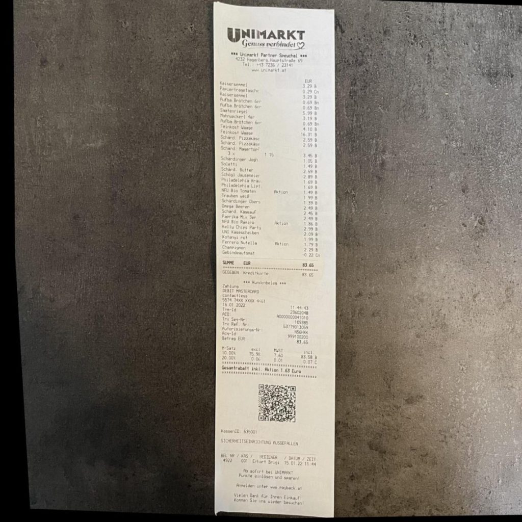 First, let’s demonstrate its OCR capabilities using a skewed photo of a receipt: